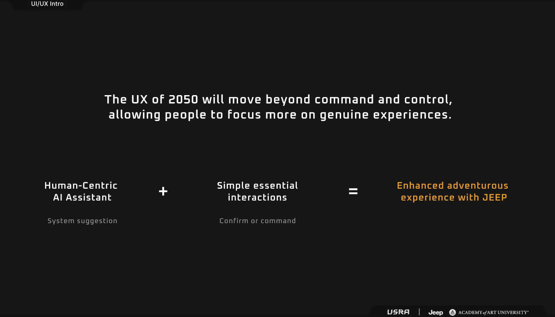 USRA: Jeep Sponsored Project. Reimagining the family road trip. By 2050, Automotive UX will shift beyond command and control, allowing people to focus on meaningful experiences.