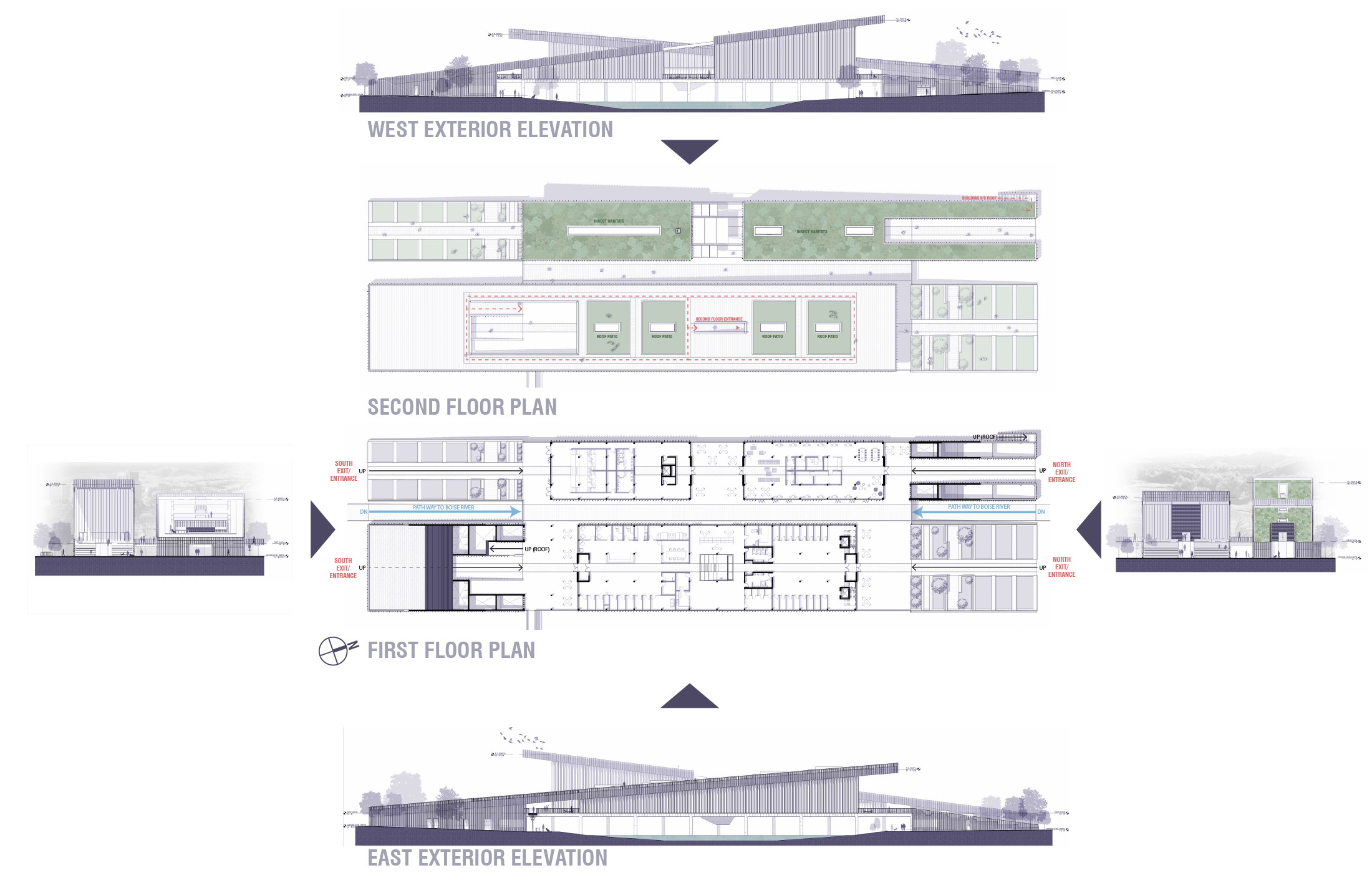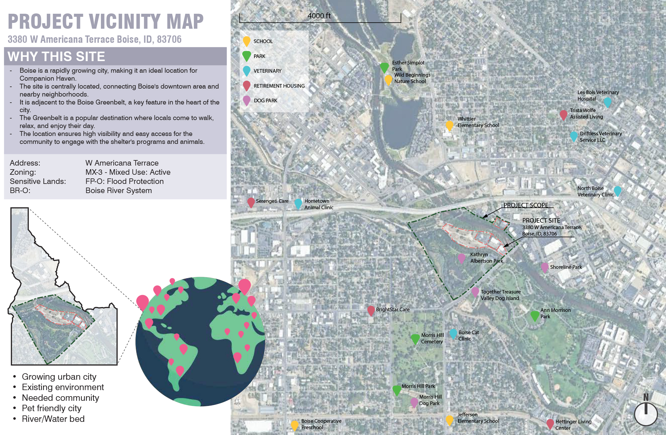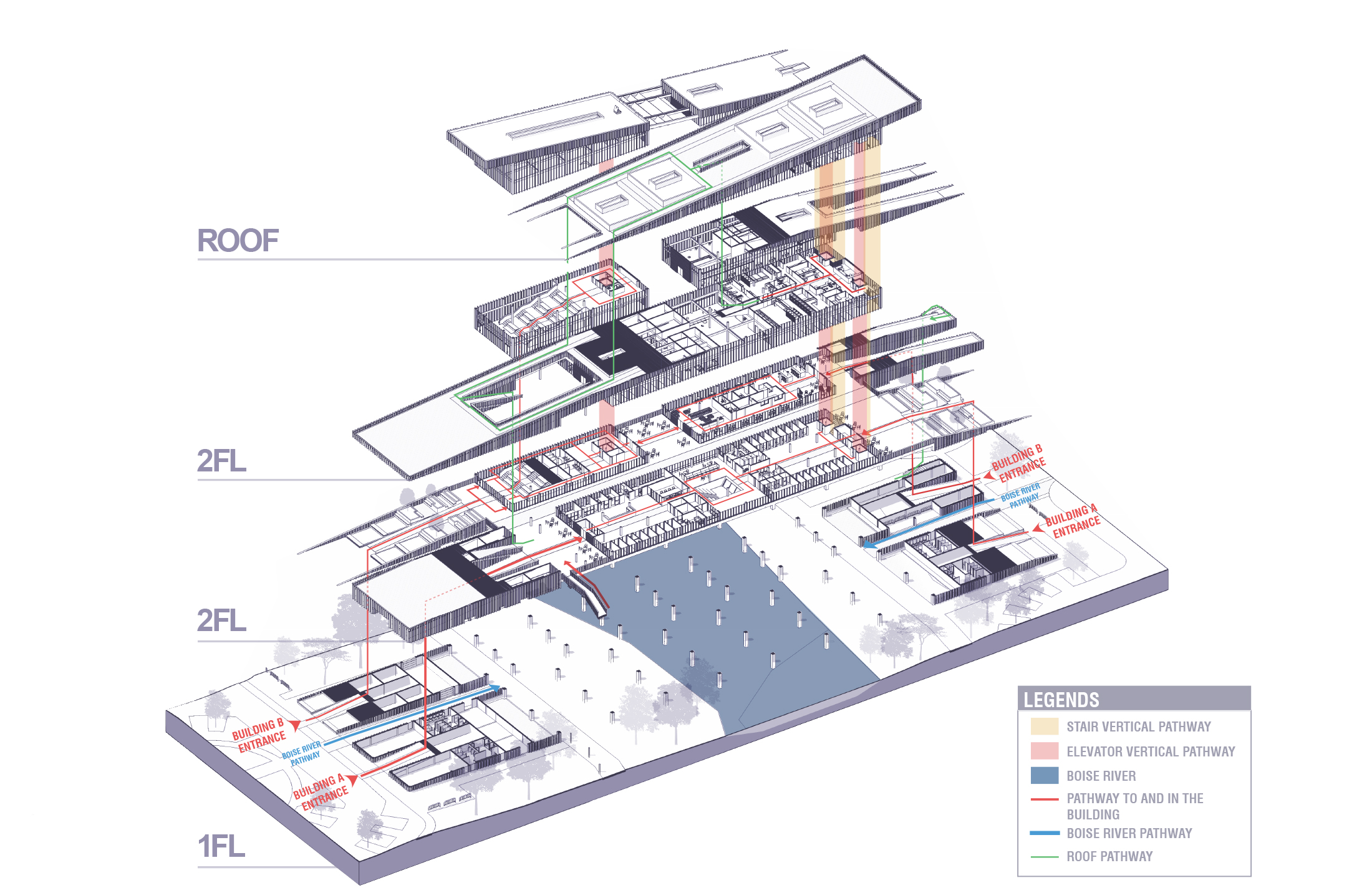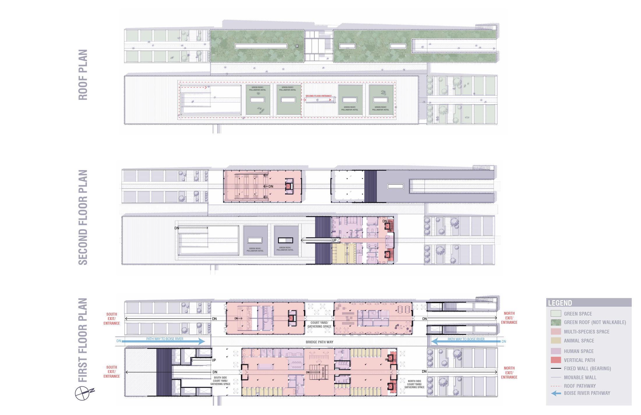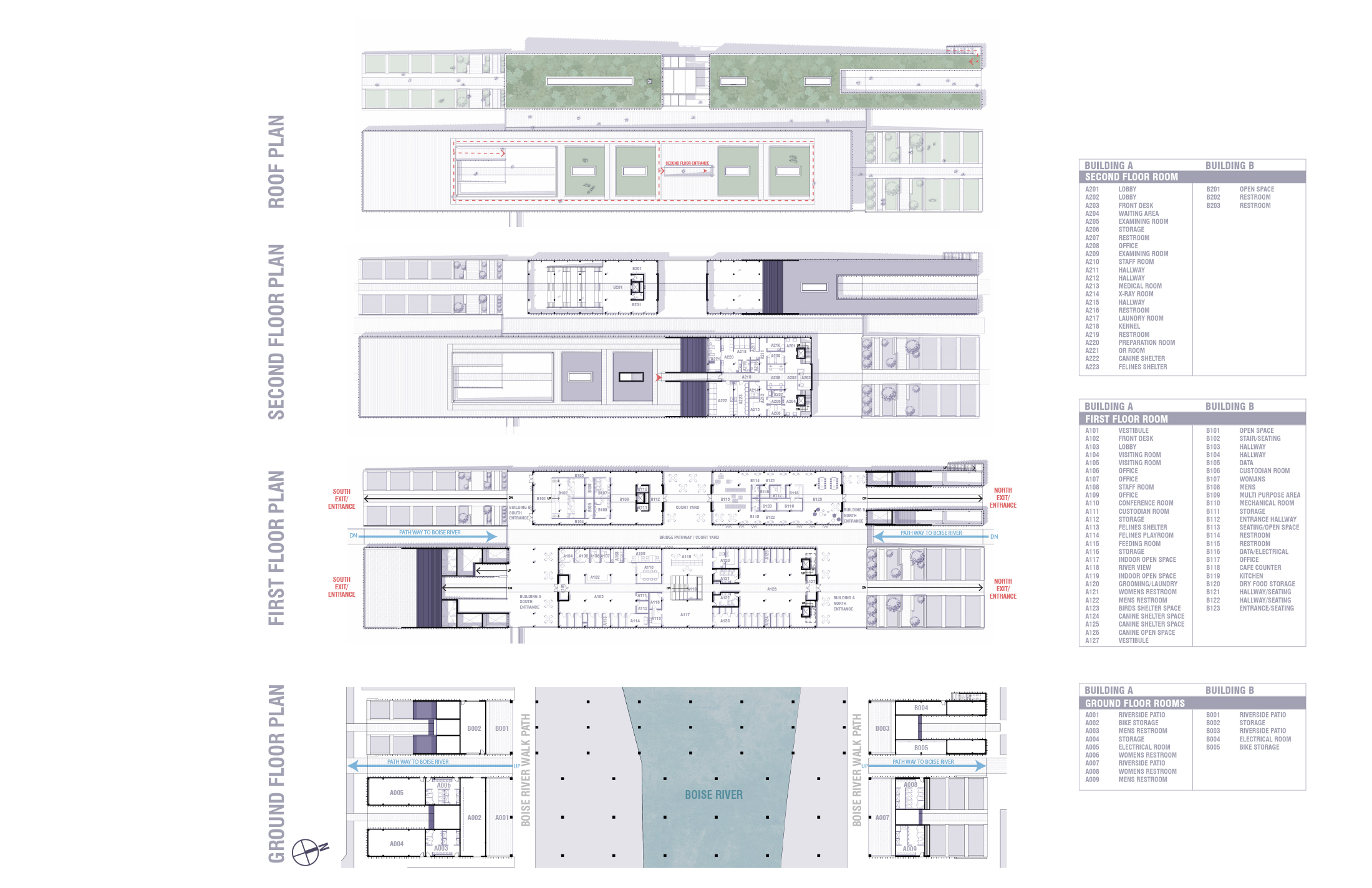 “Companion Haven” reimagines an animal shelter as a multi-species performative system—one that challenges anthropocentric norms by fostering spatial and sensory connections among human and non-human species. Situated within the Boise River watershed, the project engages the temporal rhythms of a dynamic riverine ecosystem, integrating seasonal design strategies for both flooding and drought conditions. Through cross-species programming, habitat-responsive site design, and community-oriented spaces, the proposal advances architecture as an adaptive infrastructure—supporting interspecies coexistence, environmental literacy, and shared use across shifting climatic and ecological conditions.