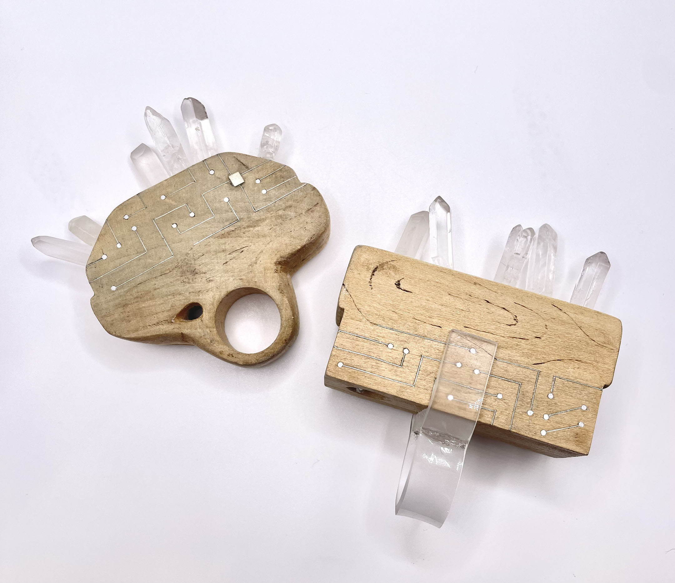 Within these two rings the story of man and nature continues. They illustrate the relationship between nature and humankind: one of the most vital and ancient forms of collaboration. This relationship has been the seed bed for new growth throughout time. These three core concepts – humankind, nature, growth – are represented in these rings using acrylic, wood, and quartz crystals. Malleable and synthetic, acrylic describes humankind’s determination to create and shape the world – and their reality. Sitting majestically atop the acrylic is a pinnacle of wood emphasizing the vastness and bounty of nature’s existence. Wire inlay and pyrography, hand manipulated techniques, add unique embellishments to the wood, accentuating the artistic partnership between nature and humankind. From this union, quartz crystals sprout up from the wood like seedlings from the soil, symbolizing new growth and beginnings.