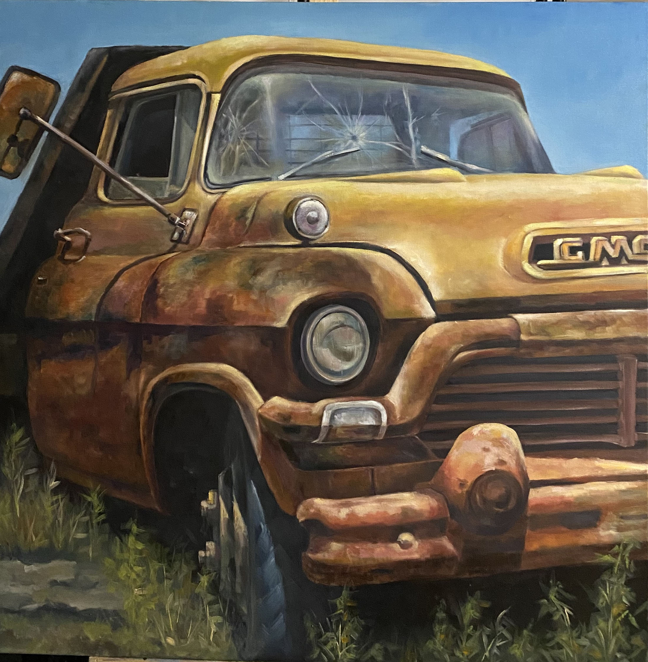 During a family vacation to Death Valley, I was inspired by the sight of abandoned automobiles and machines, noticing their rust, moss, and the effects of light and shadows. This observation led me to capture the beauty of nature by reclaiming these objects on my canvas.