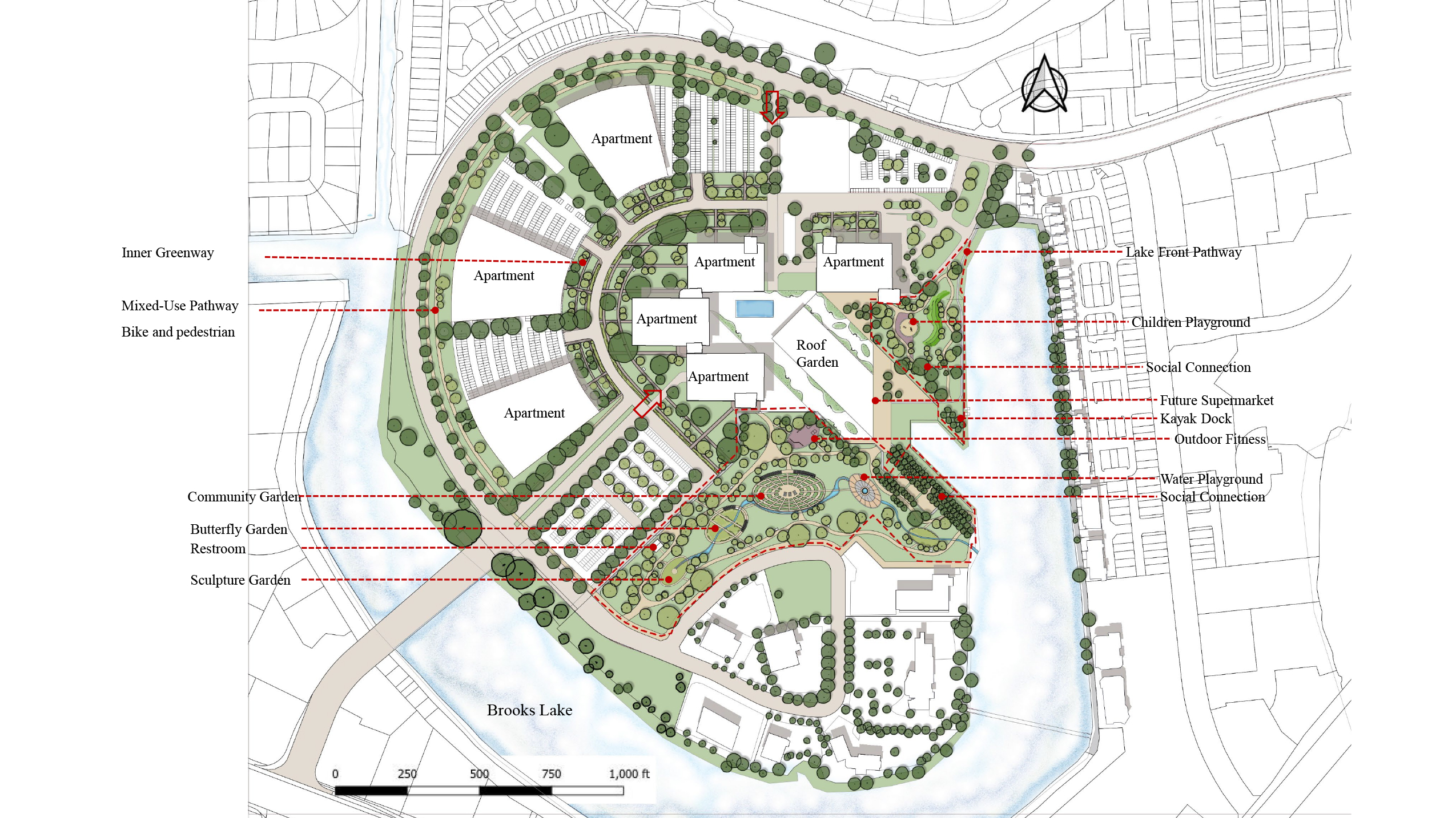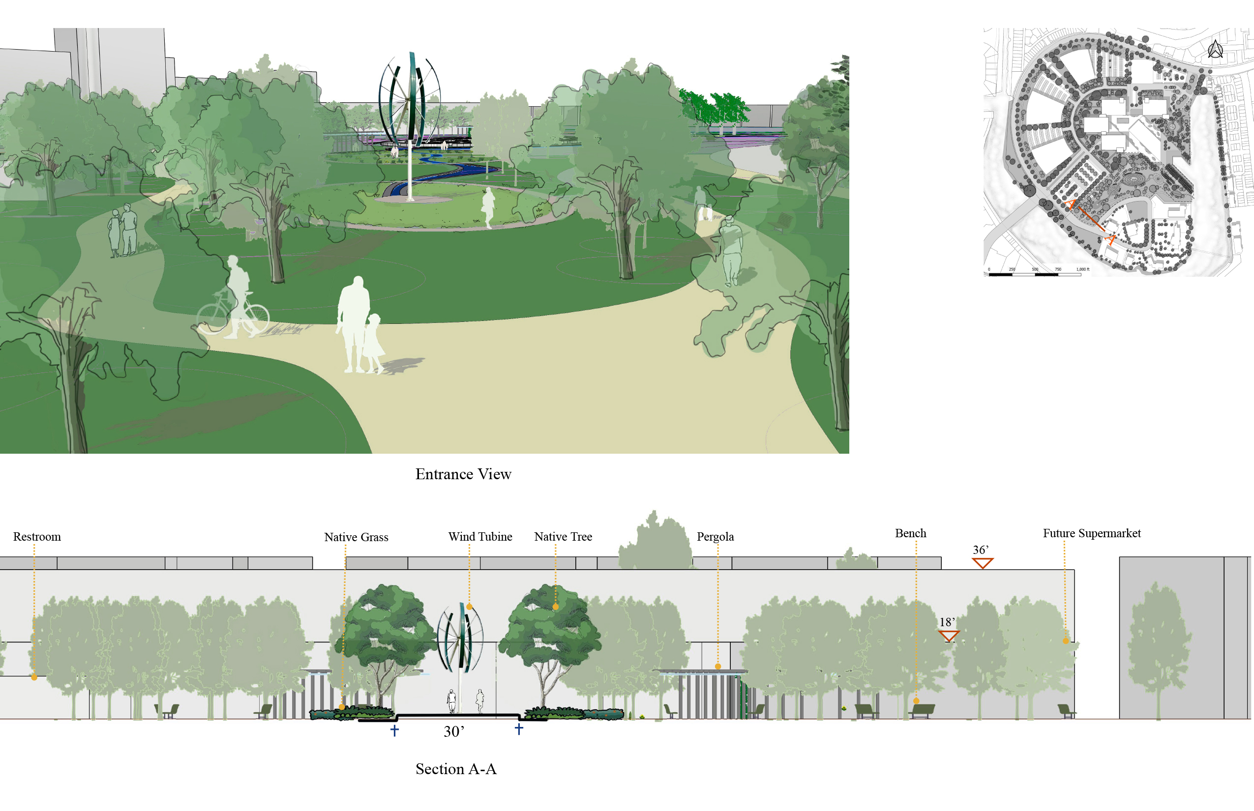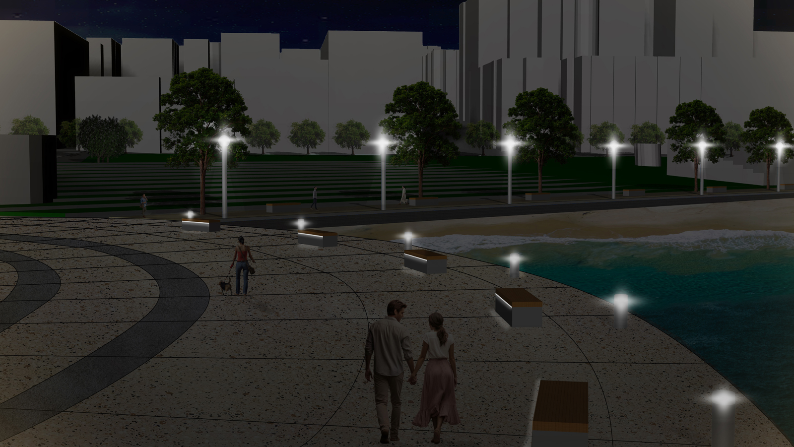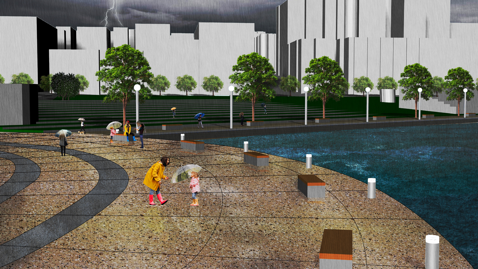New concept design for Aquatic Park: The original infrastructure is relatively scattered, with two boat docks, a beach, and a concrete stand. I hope to integrate these facilities and use the foundation of the original concrete grandstand to create a leisure green outdoor theater next to it. At the same time, the green terraces can also play a role in flood prevention in bad weather. From west to east, four circular outdoor squares connect the original facilities. From west to east, four circular observation decks connect the existing facilities. Outdoor leisure trails are added between the decks to connect the beach and outdoor green stands. Street trees are added beside the leisure trails to block the scorching sun in summer. Local landscape trees are planted near the outdoor green stands to add coolness, hoping to create a paradise in the city. The cool sea breeze allows people to stop temporarily to enjoy the sunset at the seaside. Let the body and mind get a satisfying rest.